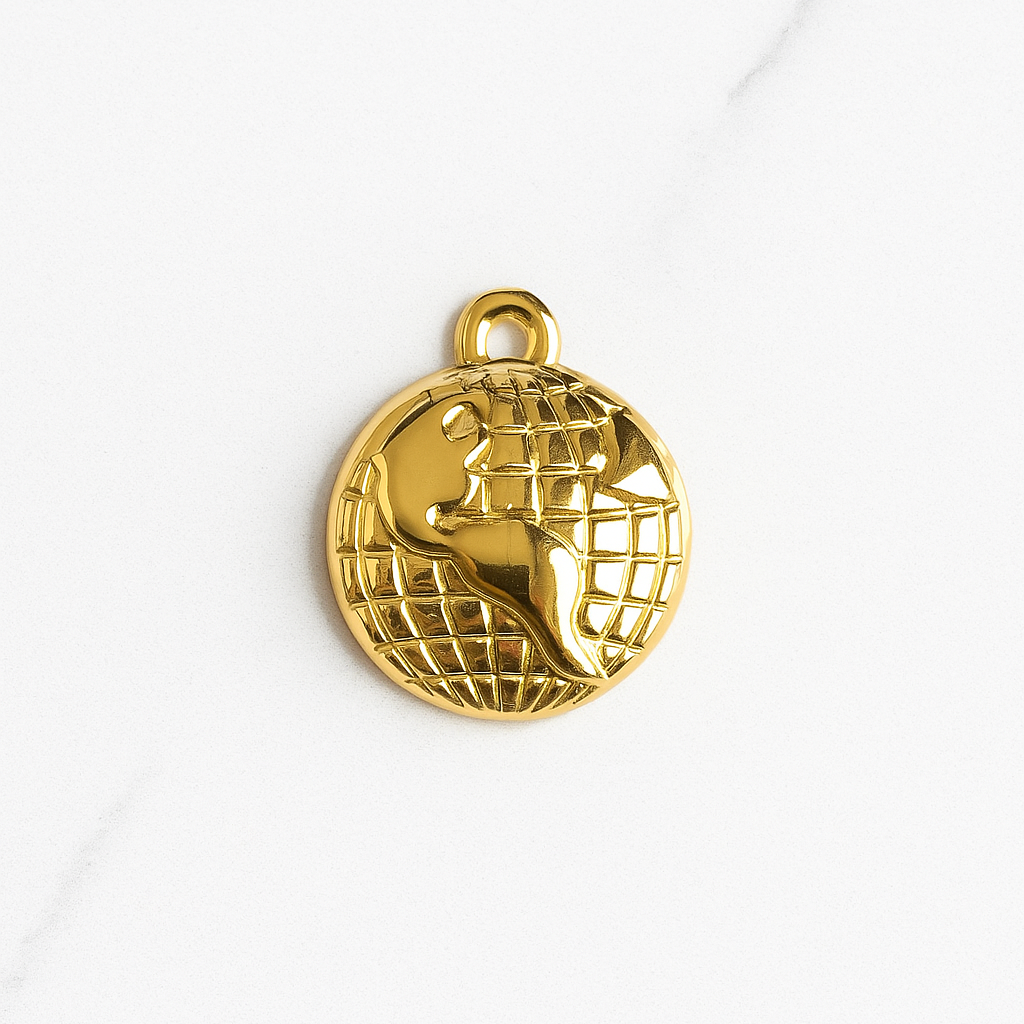 A world map charm, that comes with a hook. Can be attached to a necklace or a bracelet.